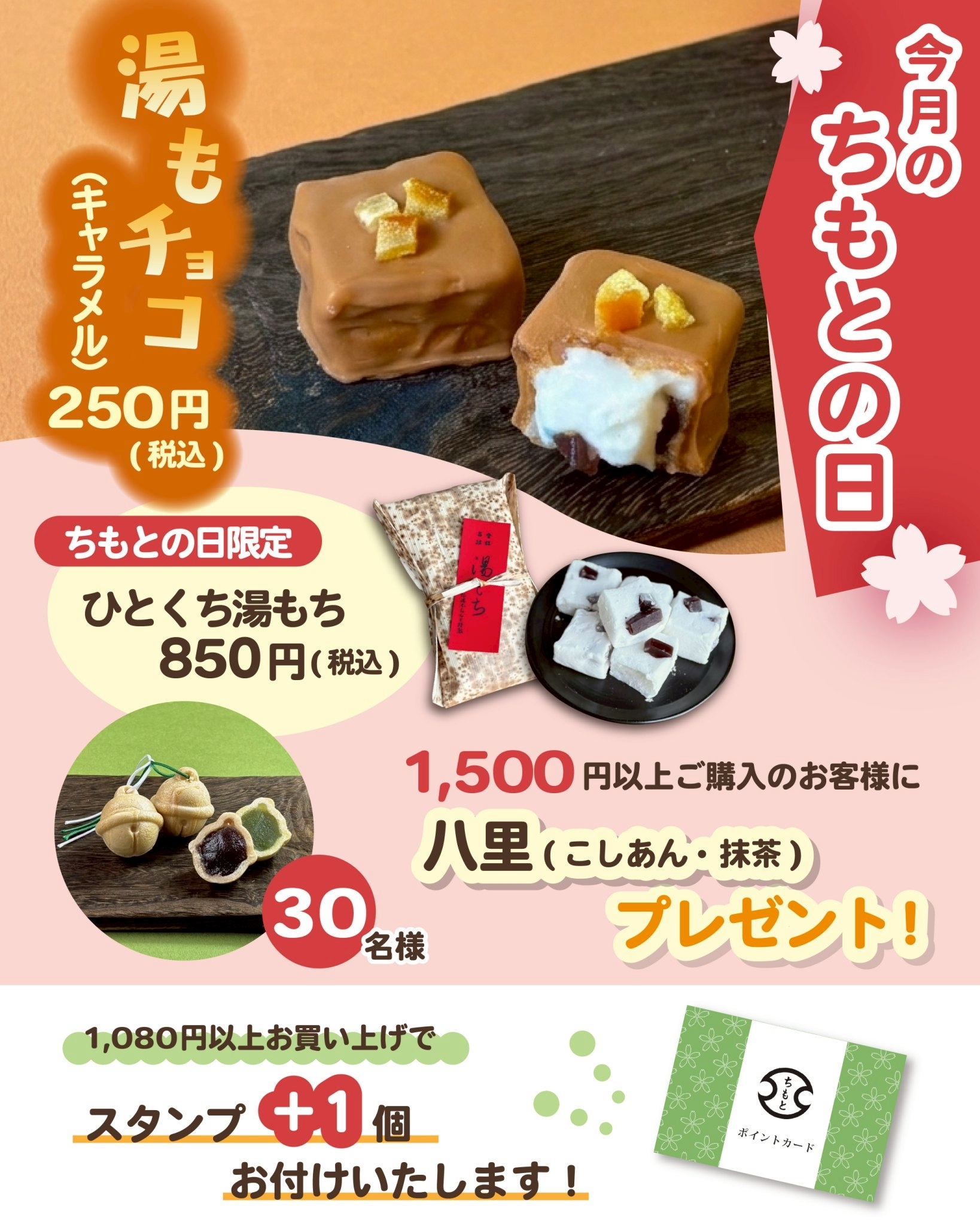 ※ちもとの日限定商品はおひとり様2個まで・「ひとくち湯もち」はおひとつまでの販売とさせていただきます。