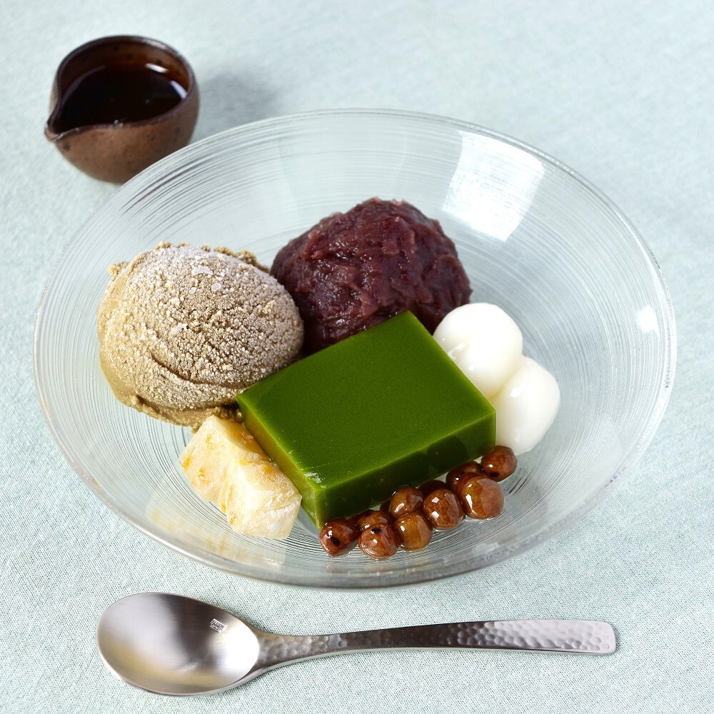 寒天・抹茶寒天・つぶあん・白玉・赤えんどう豆・あんず求肥。